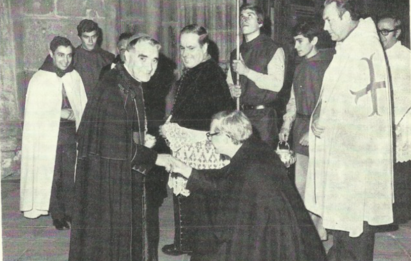 Dom Lafond entre o 2º Mestre da MSM, André Jozan e o actual, 7º Mestre, Carlos Aguiar Gomes, procedendo à assinatura do pergaminho que está na primeira pedra da cripta da Comendadoria da Imaculada, 14 de Agosto de 1976